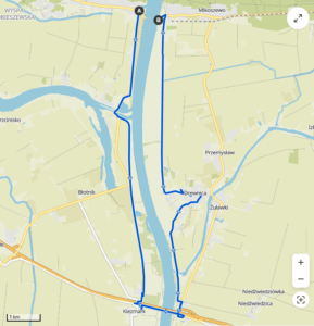 Dalszy odcinek prowadzi koroną wału przeciwpowodziowego – jednego z najszerszych i najwyższych w Polsce. To wyjątkowe miejsce do jazdy, oferujące panoramiczne widoki na dolinę Wisły, pola i łąki.