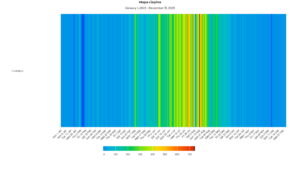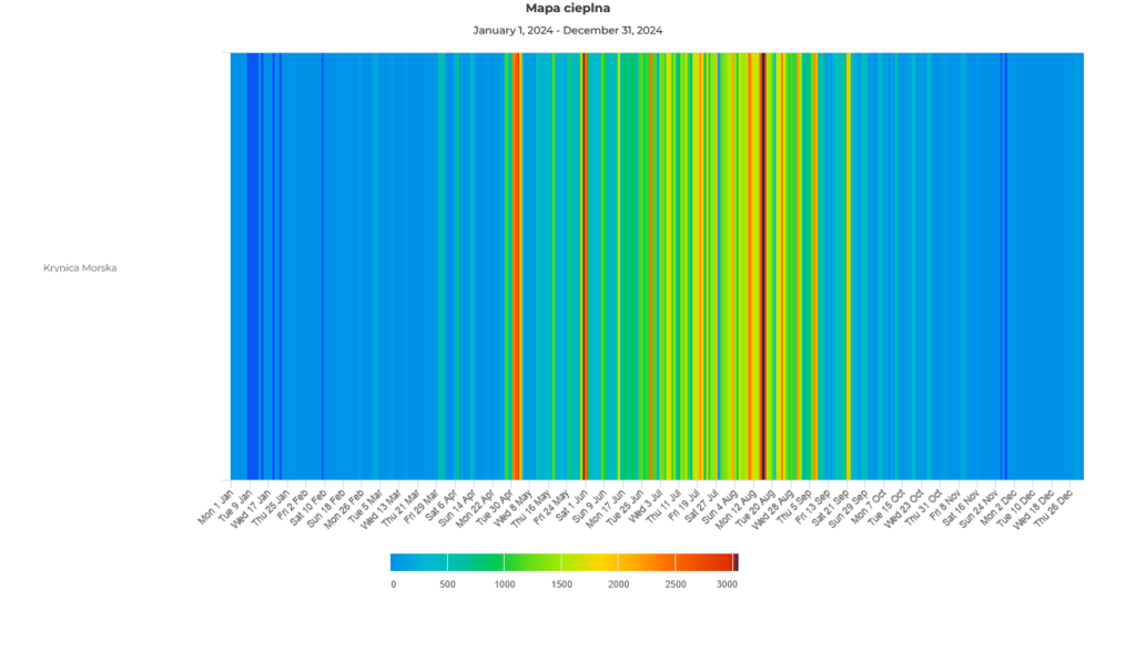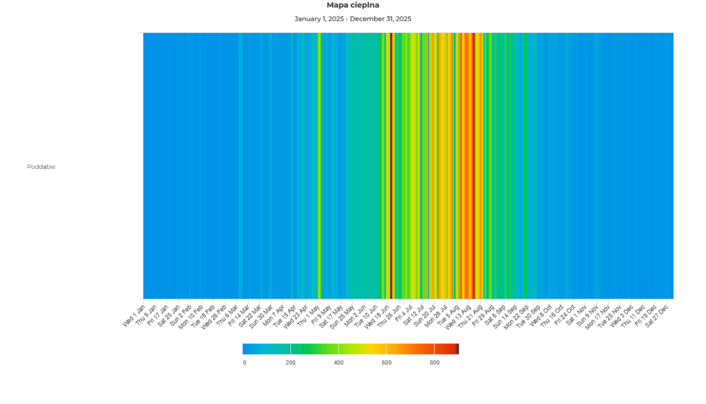 Analiza map ciepła ruchu rowerowego dla liczników w Poddąbiu i Krynicy Morskiej, obejmująca lata 2023–2025, potwierdza silnie sezonowy charakter ruchu rowerowego w tych lokalizacjach. We wszystkich latach widoczny jest bardzo niski poziom aktywności w miesiącach zimowych, stopniowy wzrost wiosną oraz wyraźna kulminacja w okresie letnim, szczególnie w lipcu i sierpniu. W obu miejscach ruch rowerowy jest w dużej mierze determinowany przez warunki pogodowe oraz intensywność sezonu turystycznego.