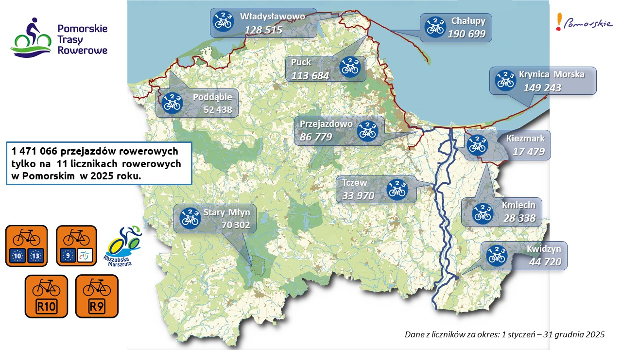W 2025 roku liczniki rowerowe monitorujące wybrane odcinki Pomorskich Tras Rowerowych zarejestrowały 1 471 066 przejazdów. Dane pochodzą z 11 punktów pomiarowych i obejmują okres od 1 stycznia do 31 grudnia 2025 roku.