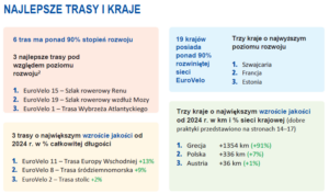 Polska jest wymieniana w raporcie jako jeden z krajów o największym wzroście jakości w 2025 roku. Polska sieć EuroVelo jest obecnie rozwinięta w 33%, co stanowi wzrost o 6% (336 km) w stosunku do roku ubiegłego. Kluczowe inwestycje objęły:
